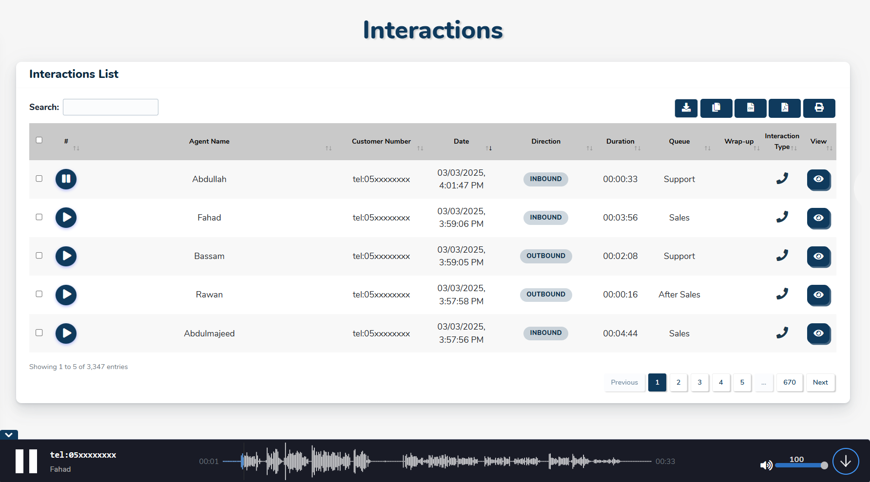 Quickly locate recorded interactions using filters like Date/Time, Agent, Duration, Direction, Queue, Wrap-up Code, and more.